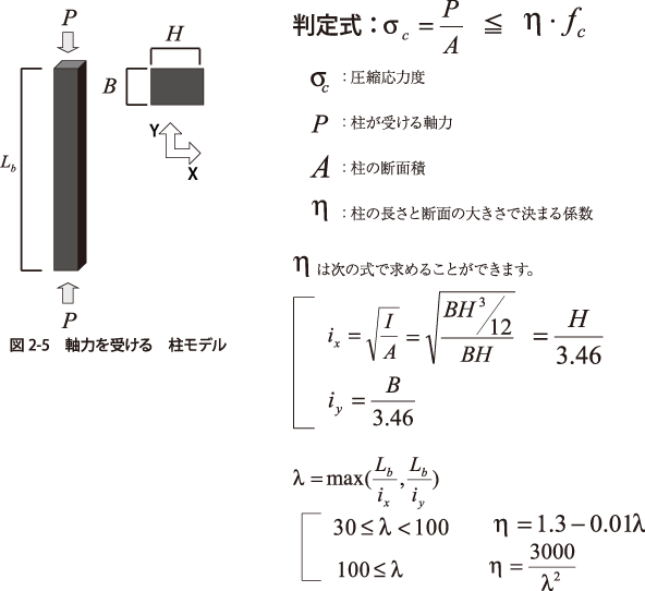 これは言い換えれば、柱に生じた圧縮力を断面積で割って出てきた値(これを「圧縮応力度」という)が、「柱の長さと断面の大きさで決まる係数×材料の圧縮強度」よりも小さければ安全性が確認されることになります。