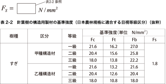 ここでは機械等級区分E70を使用していますので次の数値を採用することにします。但し、単位はkgfからNに変換することになります。