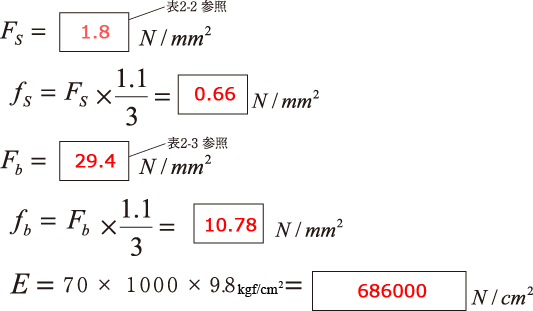 ここで使用する床梁の樹種をスギ、規格を E70 とすることにし、基準強度、ヤング係数を整理しておきましょう。